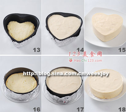 5、心形活底模外边包一层锡纸,底下铺蛋糕片(蛋糕要比模子小一圈,可以切掉外皮),倒入慕斯液即可。入冰箱冷藏至少4小时。脱模时把模具放在高瘦的杯子上,然后后吹风机吹模子四周,一会模子自然脱落(图13,14,15)。