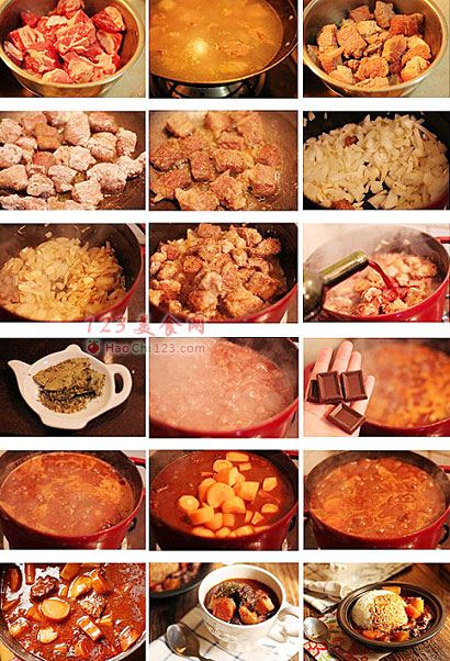6、牛肉基本上要炖上两个小时后,加黑巧克力,加入切块的红萝卜和土豆。