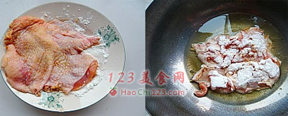 3、腌好的鸡腿有皮的一面朝上,下面粘上一层干淀粉,再把皮面朝下油锅煎炸定型,翻面。