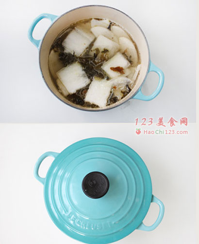 4、另起锅加入一汤勺高汤与600ML的水调匀,烧开后加入萝卜、冬瓜与炒香的酸菜烧开小火烧10分钟。