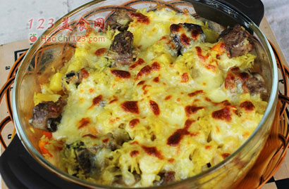 12、在上面铺上马苏里拉芝士,放进烤箱中上层,只开上火,烤至芝士融化表面微焦即可。