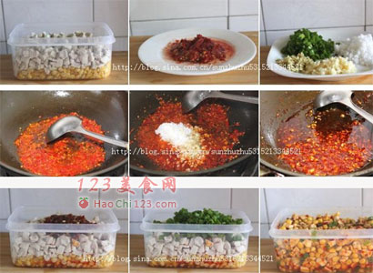 7、将做好的鱼香汁,倒入煮好的玉米和鸡丁中,在撒上葱花拌匀,盖上捂2个小时以上入味即可。