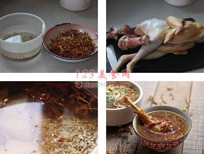 3、锅里放上泡好的薏仁、虫草花,还有鸡和棒骨。