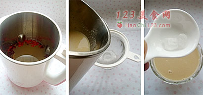 3、将黄豆、小米、红枣和枸杞子放入全自动豆浆机杯体中,加水至上下水位线之间。4、接通电源,按“五谷豆浆”键,待豆浆制作完成后将其过滤。