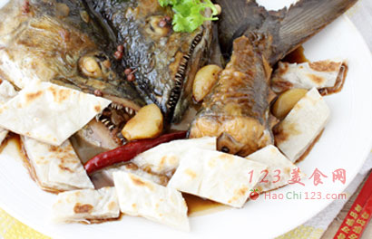 10、锅里的鱼炖至汤汁收稠(但不要收干,要留些汤汁泡饼),关火出锅,装盘,将饼切成小块泡在盘边的汤汁里。