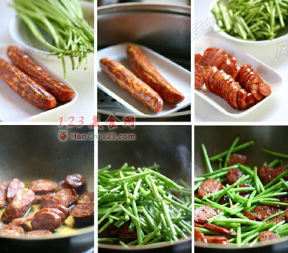 2、晾凉的香肠切成片,藜蒿洗净切成小段。