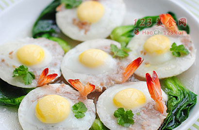 6、打上鹌鹑蛋,蛋黄位于凹印内,再撒上火腿末。