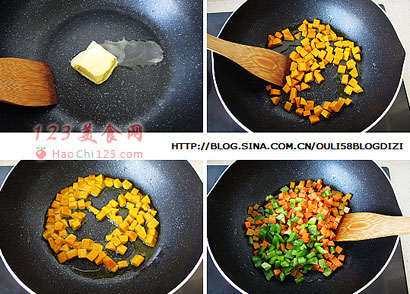 3、炒锅中放入20克黄油,黄油融化后,将南瓜丁下锅翻炒,直炒到南瓜软烂,加入青椒和胡萝卜丁翻炒至断生。