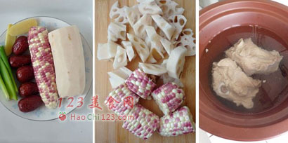 4、藕、玉米、大枣、葱、姜洗净控干水份。