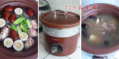 7、再放入玉米段、藕块、大枣、葱、姜。