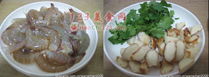 1、虾洗净去头去虾线,沙姜洗净切片,香菜切段。