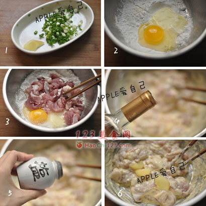 2、挂糊的话,用干生粉直接拌,不要加水搞的很稀。蛋液加少许料酒,足够了,这样炸出来的酥肉好看。