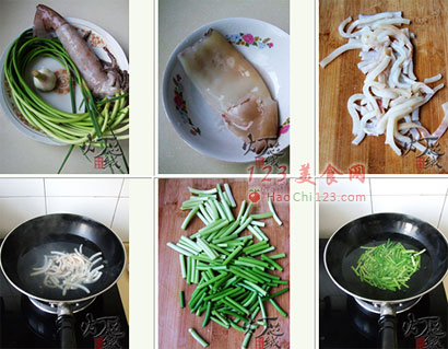 4、鱿鱼焯水时间不宜过长,变色即可捞出过凉,否则会失去脆嫩的口感。