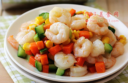 4、另起锅加入少许油,将胡萝卜和黄瓜丁下锅炒至断生,加入少许盐,加入玉米粒翻炒,然后加入事先炒好的虾仁,翻炒均匀,即可关火。