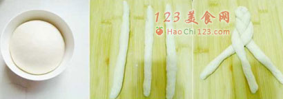 5、将发酵好的面团分割成均匀的7份,滚圆盖保鲜膜醒发30分钟后将每个面团分成3小块,搓成长条。
