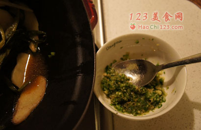 9、捞出鸡后,锅里会有些油汁,趁热倒进切碎的葱、姜末里,就是最好的白切鸡蘸酱了。
