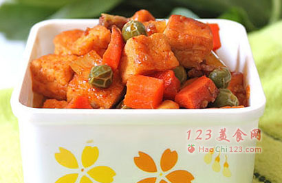 5、倒入青豆圆葱和胡萝卜大火烧开,小火焖5分钟至汤汁浓稠即可。