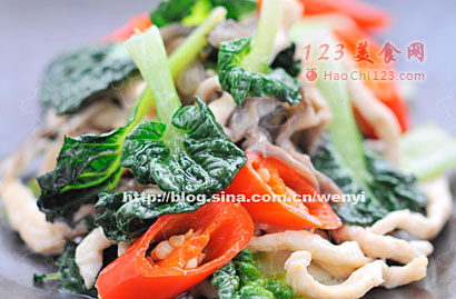 5、再往锅中倒入一点油,油6成热时,放入塌菜,此时放盐(剩余的2克)翻炒至塌菜变软,马上把平菇丝倒入,翻炒几下立即出锅。