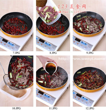 5、锅中倒入油,待油5成热时,放入辣椒和花椒,炒出香味,马上调成小火,倒入腌好的牛肉片倒入翻炒,炒到出了大量的水分后,将水倒掉。