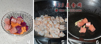 5、油锅姜片爆香后,倒入虾球翻炒到变色后盛出备用。