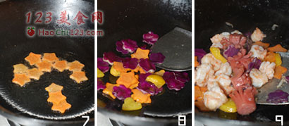8、继续倒入黄椒和紫甘蓝翻炒,并加少许盐调味。