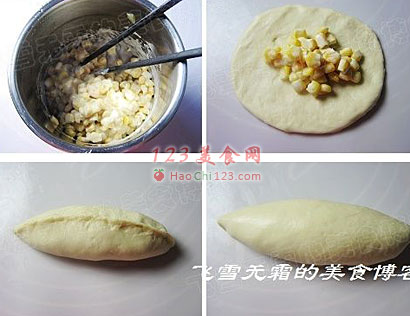 6、将小面团擀圆,包入玉米粒,包的时候,注意面团边缘不要碰到玉米,否则很难捏紧。