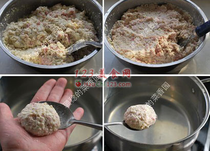 10、拌好的豆腐元子材料,就等汆丸子下锅咯(如果不马上做的话,豆腐会出水,也没关系,再少加点生粉进去,不要太多,生粉加多了口感会发硬)。