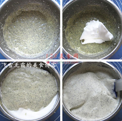 6、混合好后,蛋白取少部份,倒入芝麻面糊中。