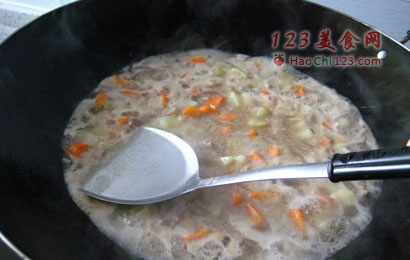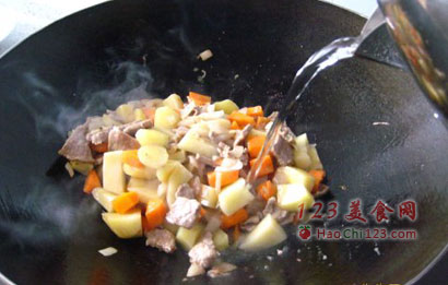 9、关火,加入咖哩块,搅拌使它融化均匀(如果有椰浆可以放一些,味道更香浓)。