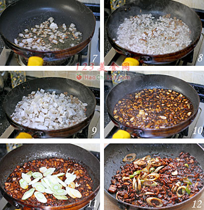 2、大葱生吃最辛辣,所以最后下,拌匀即可,过早下锅会煮得过于软烂,失去其本身的辛香味。