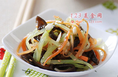 3、焯过水的三丝浸泡凉水,沥干。放入容器。放上切碎的蒜末。