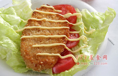 4、虽然鸡排单炸出来就已经很好吃,但如果能在外面裹上一层生菜,西红柿,再加一点点蛋黄酱,就真的好吃的没法形容。我也曾经试过,用鸡排+生菜+甜面酱(不加西红柿),又是另外一种风味,你也可以试试看。