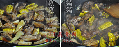 3、4、玉米去皮洗净,斩剁成段,就着锅内的底油,将玉米段粒面朝下放入锅中煎至微黄焦香;将猪展骨倒入锅中,生姜切片一同下锅,锅中调入料酒1小勺、生抽、老抽,翻炒均匀,锅内注入开水。