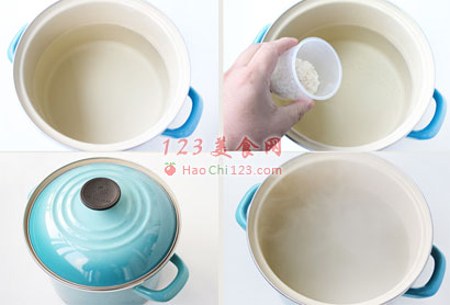 3、煮好的米汤加入盐、花椒、干姜面、葱末等配料以及切成丁状的尖椒,芹菜,鲜姜,煮开。再将羊排放入米汤中煮制,以去除羊排中的腥味,抓小火煮1小时后捞起。