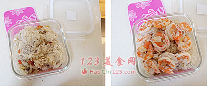 7、盛出适量的米饭,面上铺上虾仁,马苏里拉,撒上盐和黑胡椒,放入烤箱,待马苏里拉烤化即可。