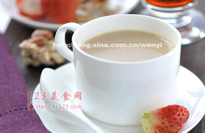 4、最后,将煮好的杏仁奶茶用滤网,过滤一遍,就可以得到更加顺滑的奶茶。夏季最好放入冰箱里冷藏后饮用,效果更加。
