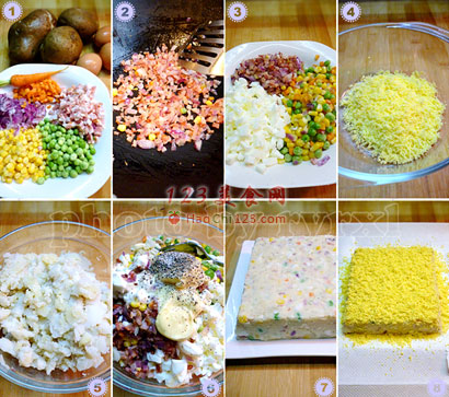 7、将拌好的土豆沙拉放入方盘中间,整形成正方形