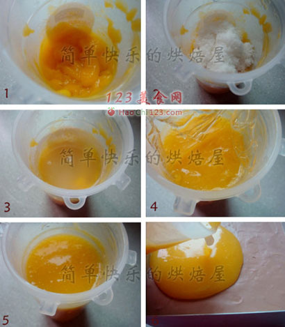 1、芒果果肉切成小块,用多可必打成泥状,加入白砂糖。