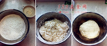 5、酵母用温水冲泡开,加至在面粉里,拌成面疙瘩状,再揉至光滑面团。