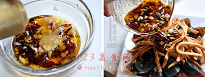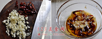 3、4、将蒜瓣拍碎,剥去外皮稍加斩剁成碎末放入小碗中,干红椒去蒂去籽剪成椒丝放入小碗中;切蒜的同时,烧热两勺食用油,将花椒粒爆香,捞出放入小碗中,将油继续烧滚浇淋入小碗中,“激”出椒蒜的香味。