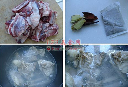 2、紫砂锅加水,烧开,放羊排,加姜、桂皮、炖肉料。