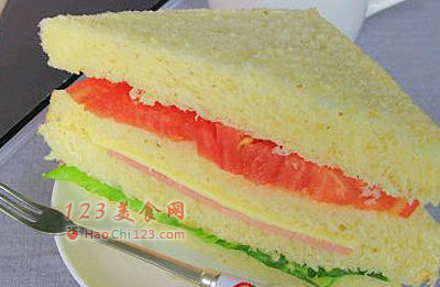 3、再放上一片土司片,放上光明片状奶酪和烟熏火腿片。