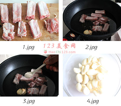 3、炒排骨的时候,油可以稍微多一点,排骨炒到金黄,放入大蒜,大蒜要炒透,这样就不辣了。