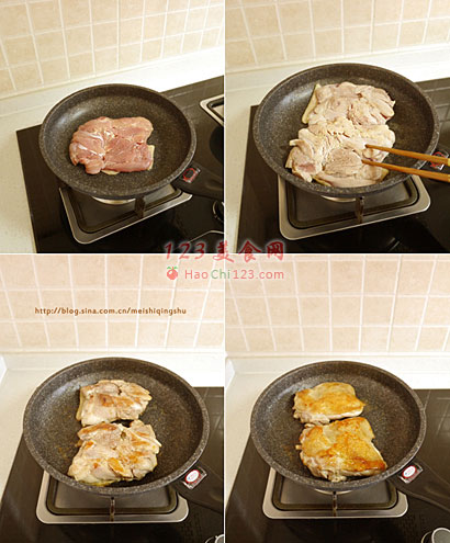 4、烫蔬菜的同时,另取一只锅煎鸡腿,不放油,直接下入鸡腿去煎,鸡腿会出很多油,耐心将鸡腿煎到金黄色。