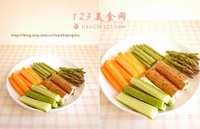 2、把胡萝卜,芦笋,铁棍山药,黄瓜都切成条状。铁棍山药不必去皮。黄瓜可以在热水里烫一下再切条。