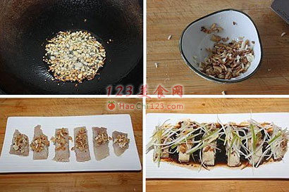 7、将提前用蒸鱼豉油、辣椒油、醋拌好的调料汁倒入鱼盘中,上面放上提前切好的葱白丝(将一段葱白剖开,竖着切成细丝然后放入凉水中浸泡就会微微弯曲)、姜丝和青椒丝,再在每块鱼上都点上一点大蒜油即可。