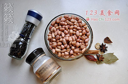 6、将去皮晾干水分的花生仁放入烤箱烤笼内,香辛料用温水稍加淘洗后,拭干水分也放入烤笼中。