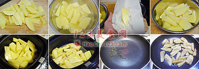 4、如果没有空气炸锅,用微波炉加锅子油炸也可以的。将土豆处理到第3步结束,放入微波盘中,盖好保鲜膜,微波至土豆变软,用牙签很轻松的就能插进去,然后取出擦干水分并晾到不烫手,再在锅内加入适量花生油烧至八成热,中火将土豆角下锅炸成外表金黄色即可进行第8步。先用微波炉微到基本熟透再炸,是为了短时间让土豆角外皮酥脆,而不用担心内部未熟。这样土豆本身吸入的油不会太多,吃起来不会有负担。
