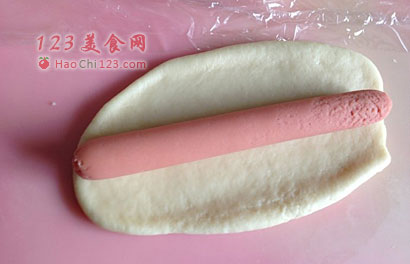 5、无需静置小面团,直接取一份面团,擀扁圆包入火腿肠。