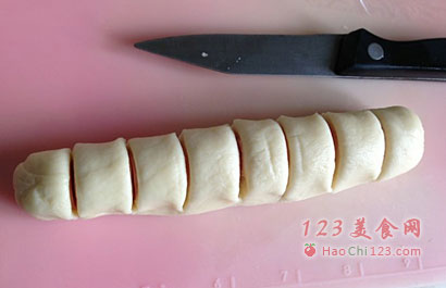 7、大收口朝下,小刀在面包胚上切出均匀间距。注意不要切断底部面皮啦!
